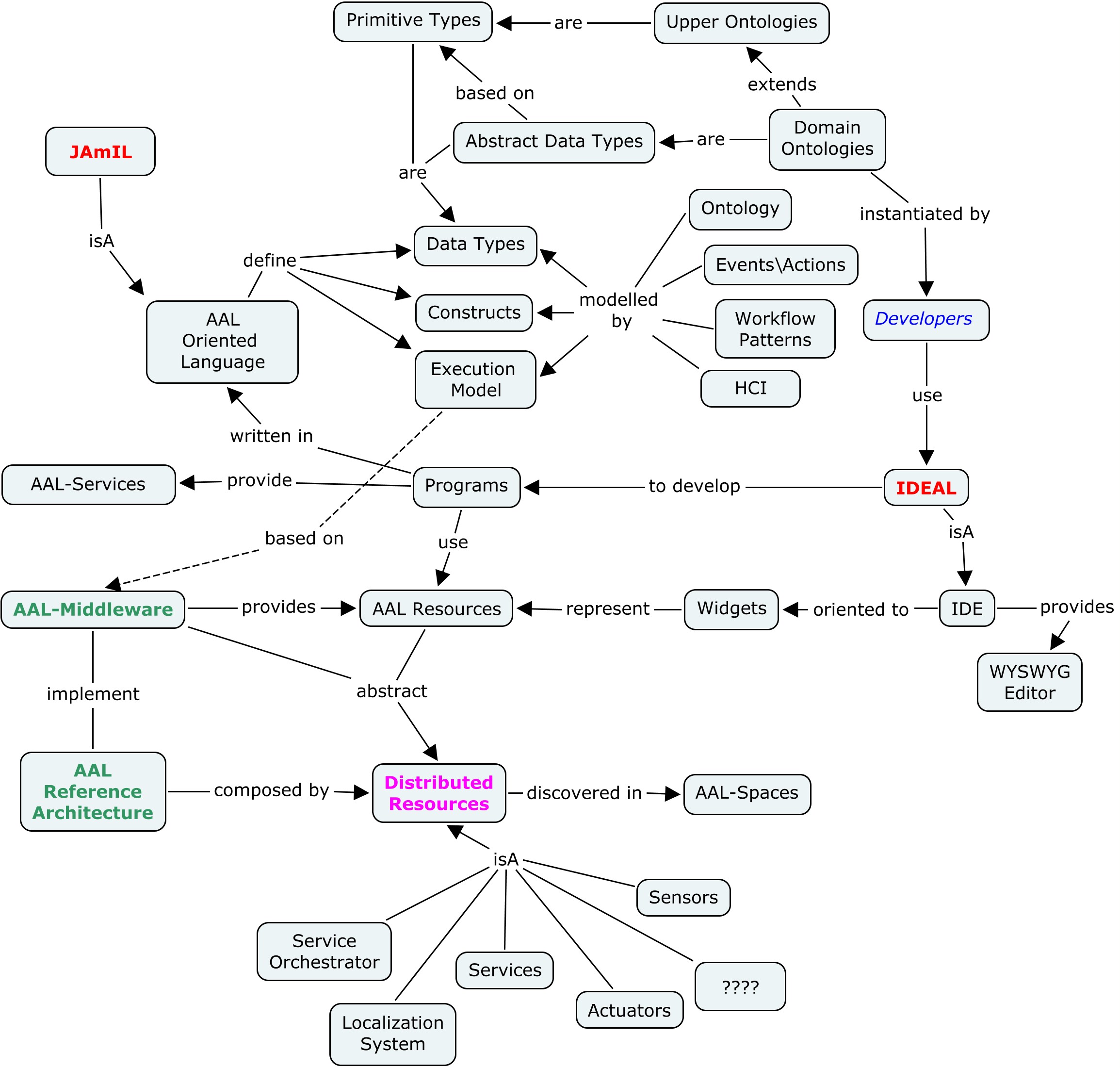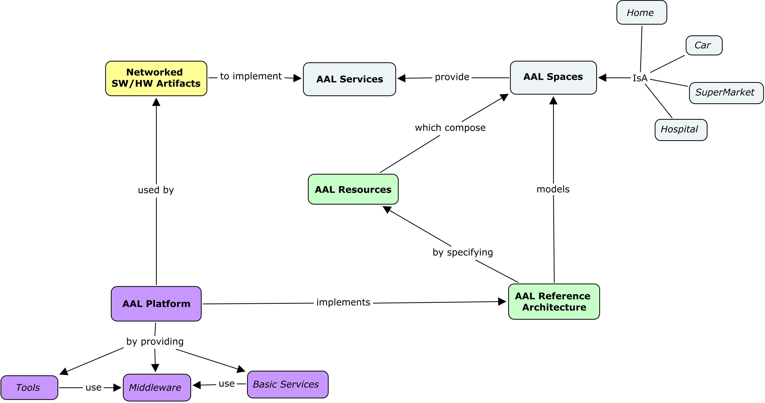 The vision, introduced by the Manifesto, moves from the idea that the increased communication capabilities should be easily used by programmers that want to write added value services. For example, a nutritional advisor program doesn’t mind if the weight of the assisted person is provided by a Wii fit console or by an enabled Continua scales, as today programs don’t care of knowing whether the video/sound cards are Creative, NVIDIA or others. These devices are connected to the main board buses and abstracted by the Operating System. The middleware running on each networked device should enable similar connections, by providing virtual buses abstraction. The binding to the resources, addressed by programs, are then resolved at run time, by using the middleware capabilities. Therefore, how our vision is related to the paradigm shift explained above? We are proposing an holistic view of the networked devices: Many as One. A zooming out of a fractal structure, starting from a system on a chip (SoC) and ending to a system on air (SoA). We are interested to aggregate the systems that are locally interconnected, and to consider them as a single unit as a new System. The Home PC will be the set of computational systems interconnected at home. The developer will develop the program as usual, and an installer will deploy the program on the PC. It doesn't mind how many resources are involved, the middleware will check and guarantee the adaptation of the program to the resources available in the environment. A concise description of what AALOA wishes to realize is represented by few conceptual maps: